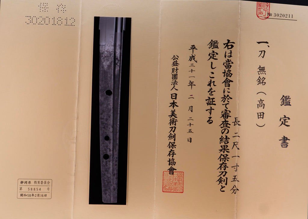 ・All our swords are registered in the Agency for Cultural Affairs as artwork and The Board of Education(Cultural properties protection Committee); therefore each sword has the registration card, issued by the Board of Education.