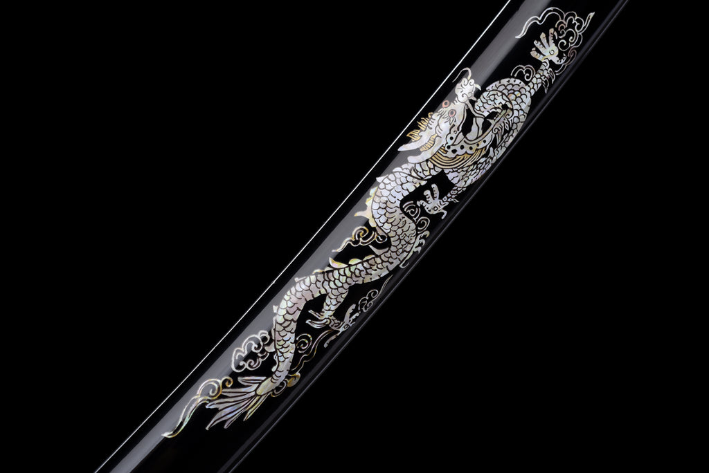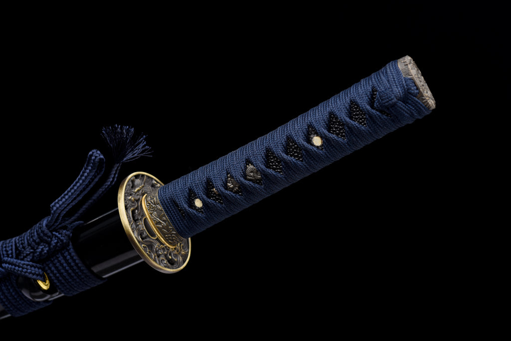 Scabbard (Saya 鞘): High-gloss black lacquer is embellished with a striking silver dragon inlay, pairing perfectly with the navy sageo.