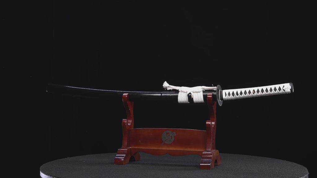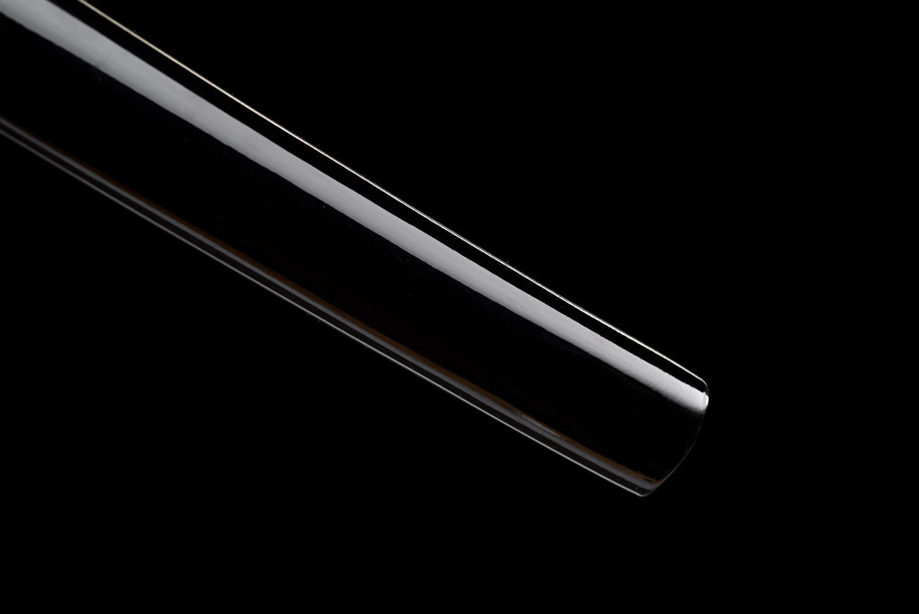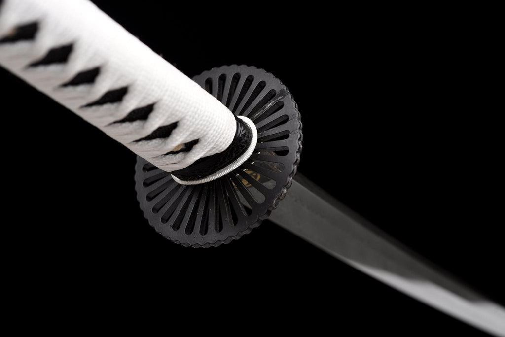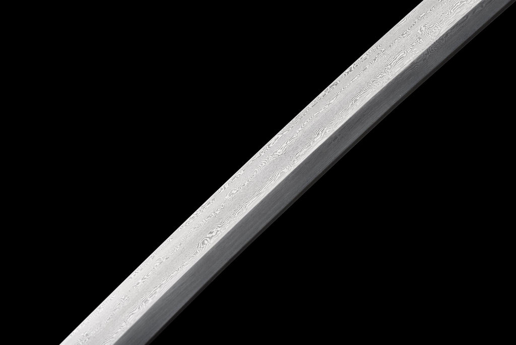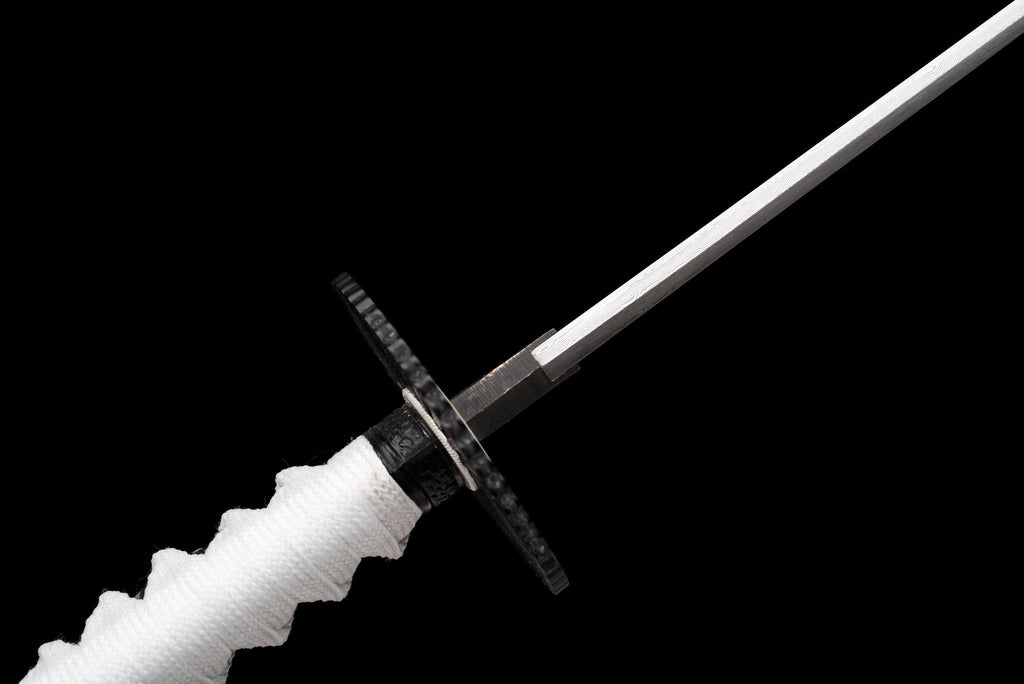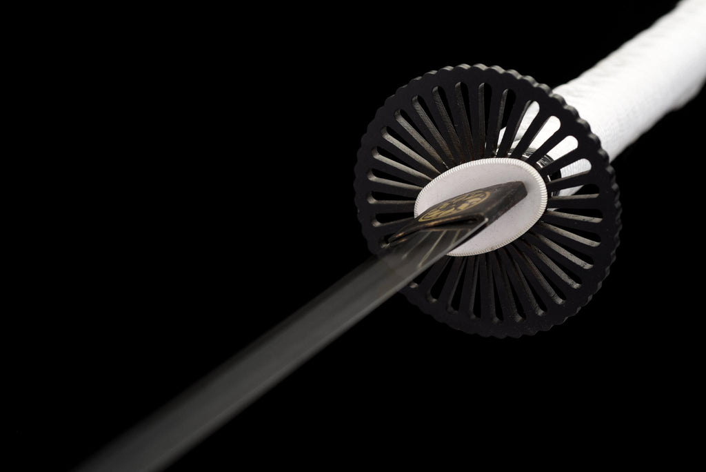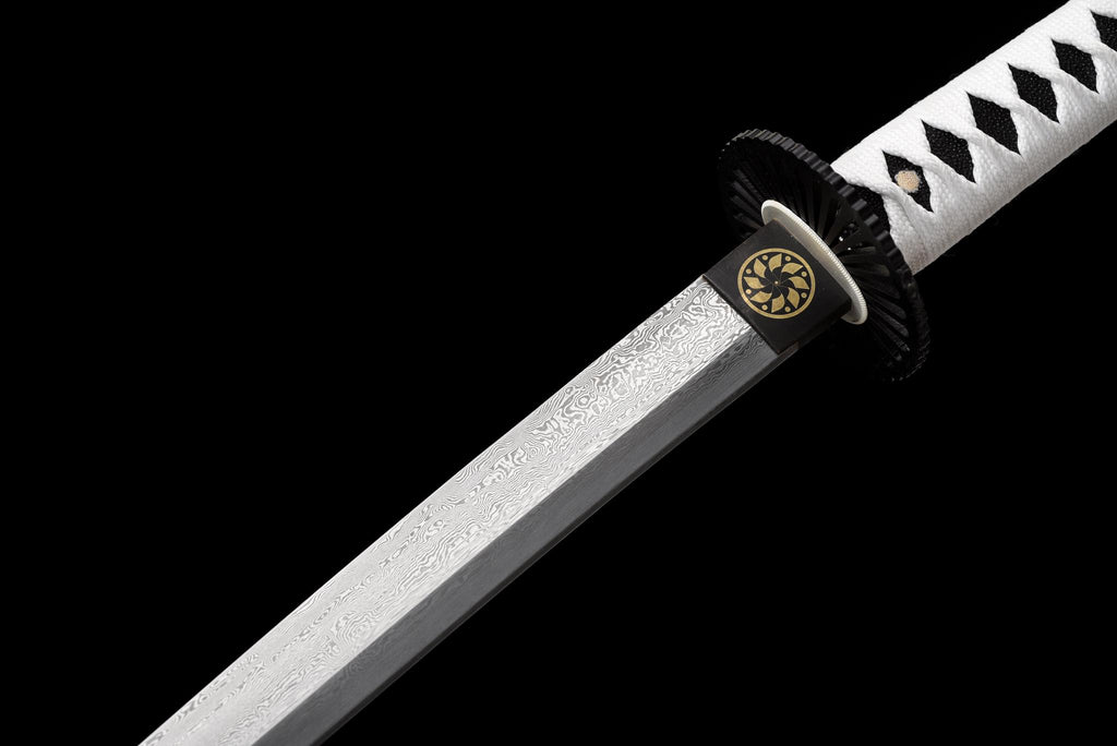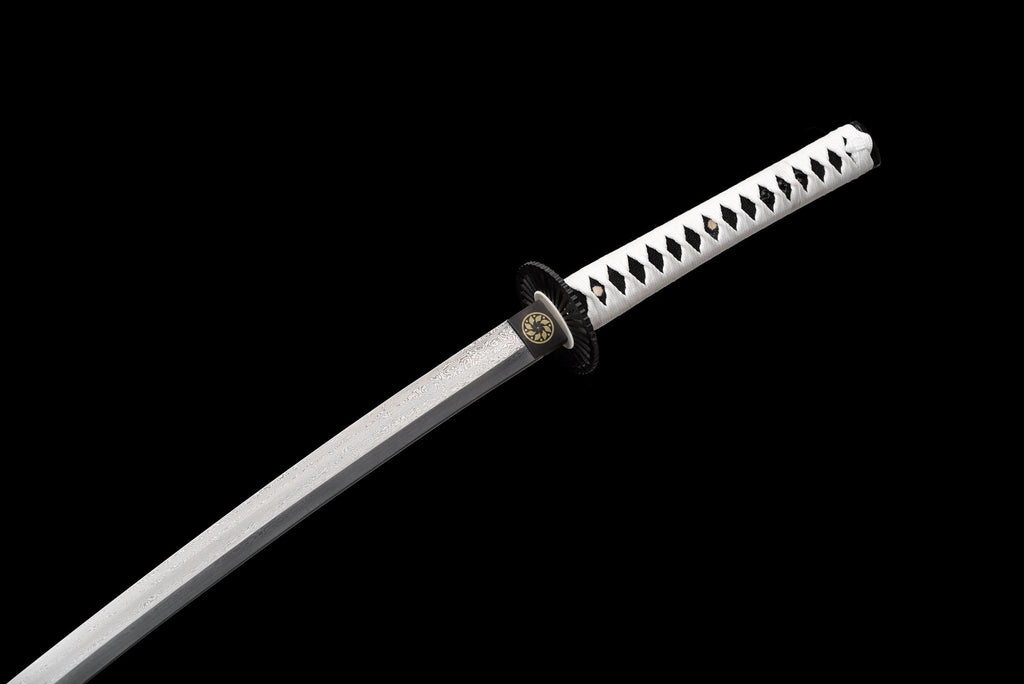 The Shirasagi no Katana (“White Heron Sword”) embodies purity, precision, and calm strength. Forged from folded Damascus steel, the blade reveals mesmerizing layered grain and a soft wave hamon, mirroring ripples over still water. Its pristine white tsuka paired with a deep black lacquer saya symbolizes the perfect harmony of light and shadow — serenity balanced by power.