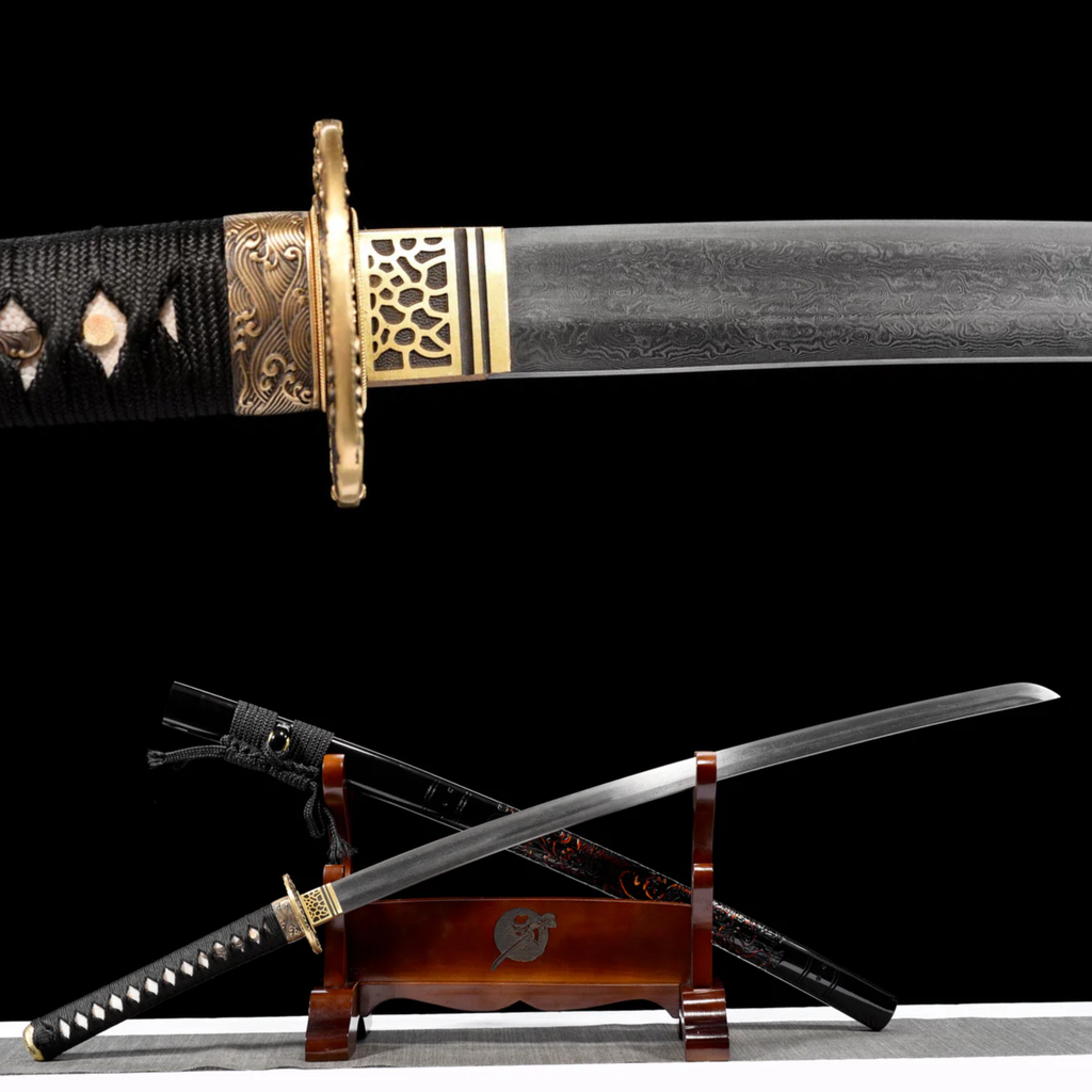 Guard (Tsuba 鍔): The finely sculpted brass Tsuba is embellished with intricate patterns, illustrating the skill of the craftsmen. The sumptuous design is inspired by the undulating, majestic form of the dragon, symbolizing wisdom and strength.
