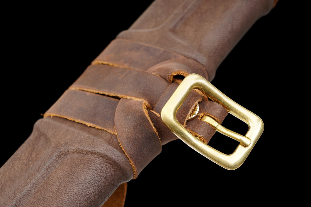 Wooden base wrapped in hand-stitched artificial leather with brass buckles |