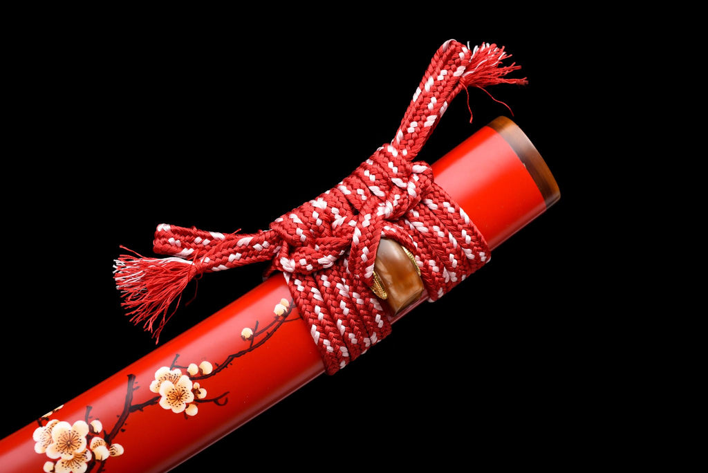 Gloss red lacquer saya hand-painted with blooming ume (plum) flowers and black branch motifs. A matching red-and-white silk saya obi completes the refined presentation. |