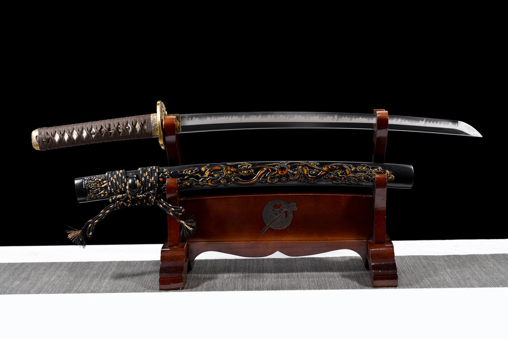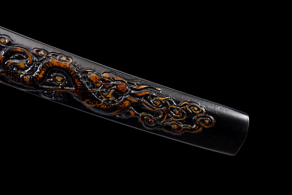 Scabbard (Saya 鞘): Black lacquered and adorned with golden dragon carvings, the saya enhances both the Wakizashi's aesthetics and its mythical aura.