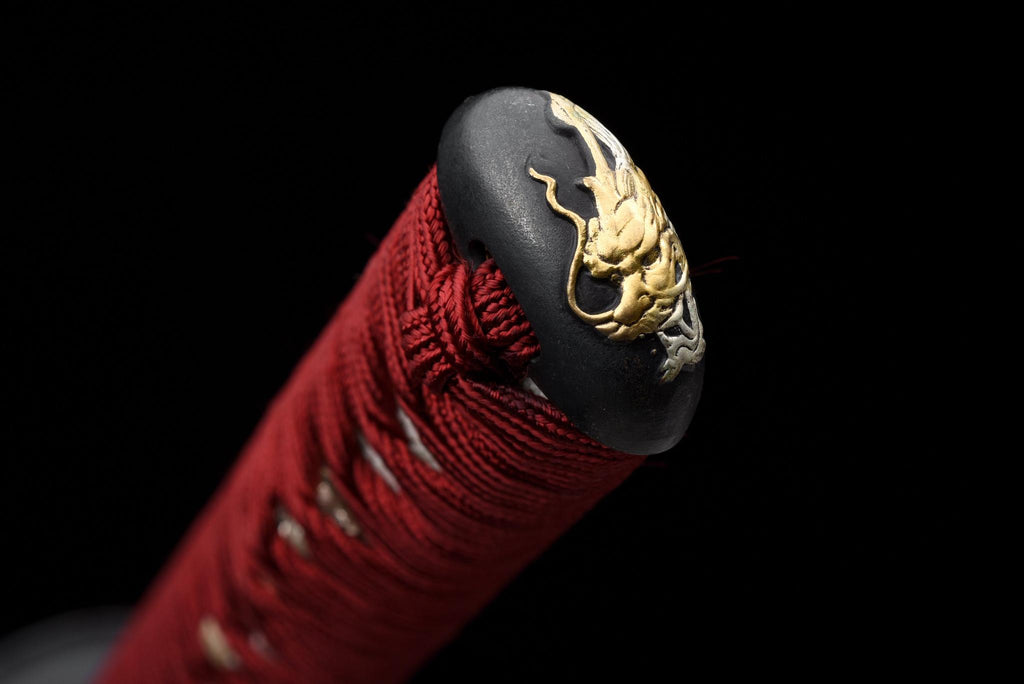 The Kōryūtō (紅龍刀), or “Crimson Dragon Blade,” is a masterpiece that embodies the fierce power and elegance of the dragon — an eternal symbol of strength and honor in Japanese tradition. Its vivid red handle and lacquered saya infused with golden flakes evoke the image of molten fire and celestial power, giving this katana a commanding yet refined presence.