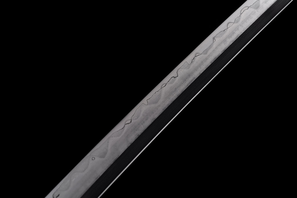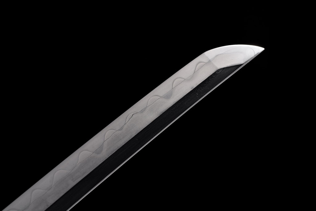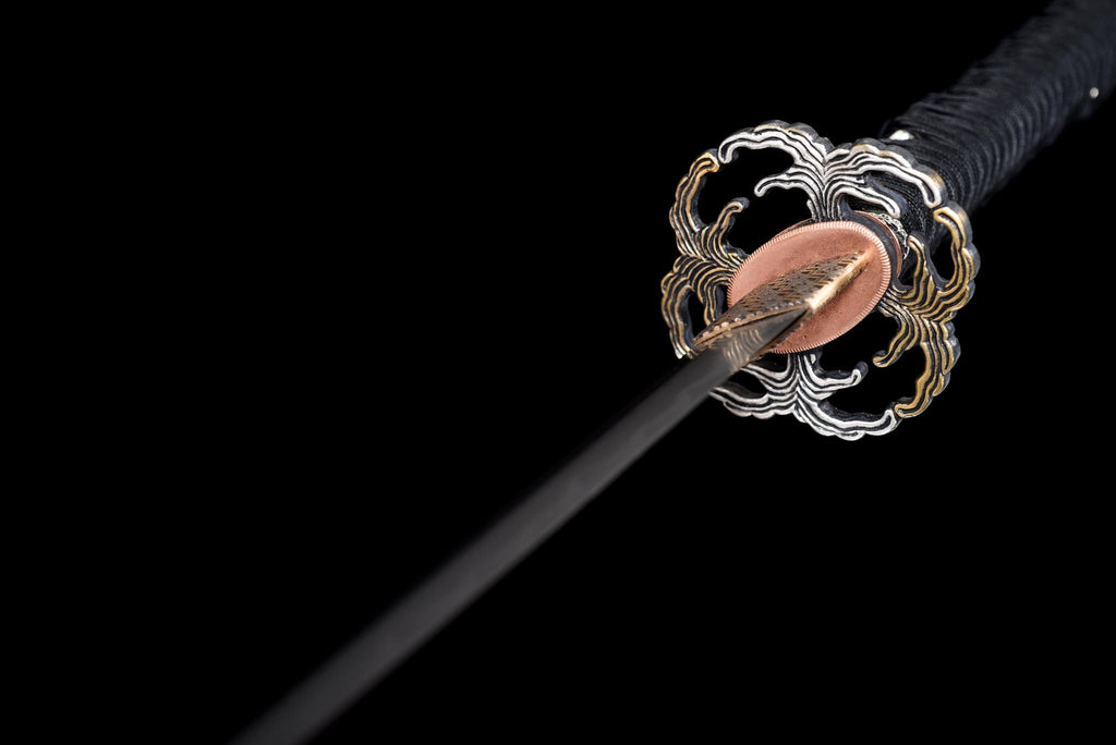 The Kurotaka Katana — meaning “Black Hawk” — embodies precision, grace, and lethal beauty. Forged in San-Mai construction, its triple-layer steel formation delivers exceptional edge hardness with a flexible, resilient core. This sword’s black lacquered saya, adorned with swirling engravings, and its gold-accented fittings evoke the image of a hawk gliding silently before the strike.