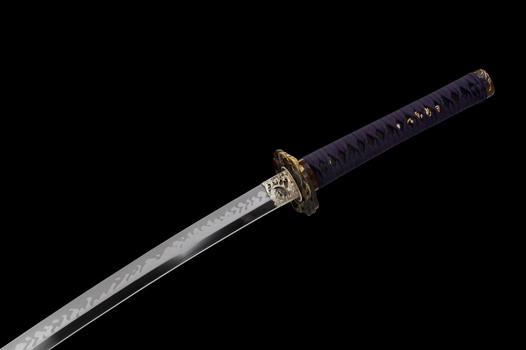 The tsuka (handle) is wrapped in deep purple ito over black samegawa, giving the sword a refined and regal presence. The fittings are crafted from solid copper with antique finishing, featuring an intricate octopus-themed tsuba, fuchi, and kashira—a rare maritime motif representing intelligence, adaptability, and the mysterious depths of the sea.