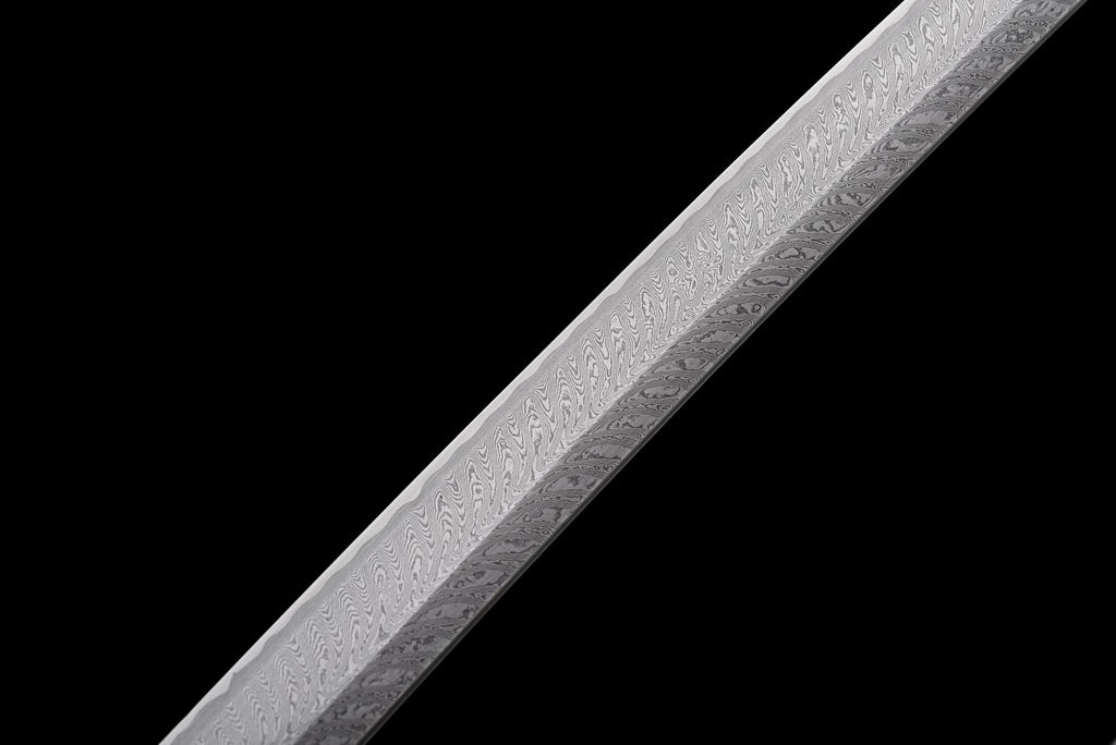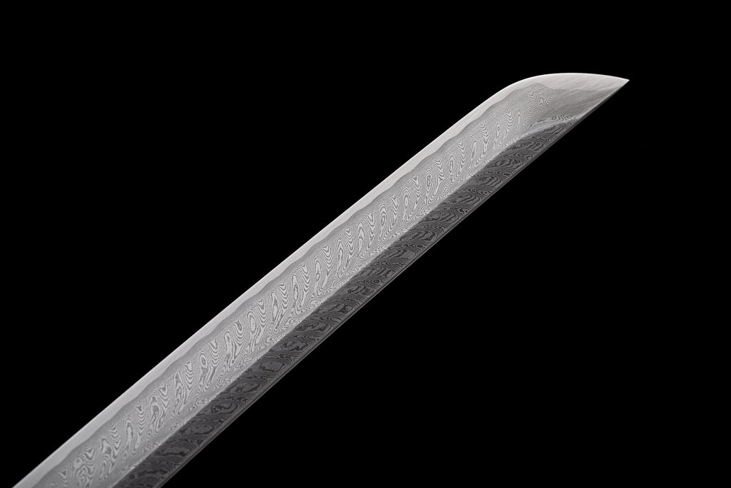 The Suirantō 翠嵐刀 embodies balance between serenity and power. Its Damascus steel blade, with swirling wave patterns, mirrors the flow of wind through forests. The jade-green silk wrapping and golden copper fittings create a visual harmony between nature and craftsmanship.