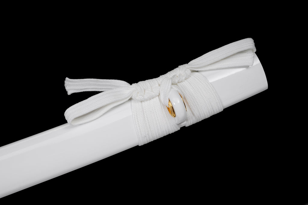 Handle (Tsuka 柄): The full white wrap over rayskin offers a firm grip and matches the sword’s minimalist yet powerful aesthetic.